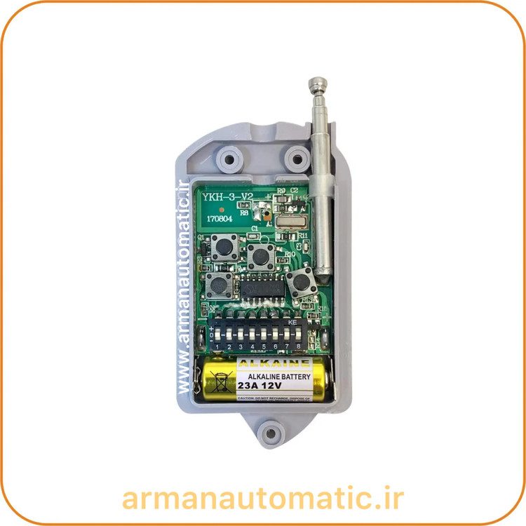ریموت دیپ سوئیچ بارزانته فرکانس 433 با قابلیت استفاده برای تمامی موتورهای ساید دیپ سوئیچی با 8 دیپ سوئیچ به جهت کدهی با قابلیت on و off کردن. ریموت دیپ سوئیچ معمولا از آی سی PT2262 به عنوان انکودر یا فرستنده استفاده می کنند.و از آی سی PT2272 نیز به عنوان دیکودر در مدار گیرنده بهره می برند.در این نوع از ریموتها در مدار گیرنده معمولا با استفاده از دیپ سوئیچ یک کد 8 بیتی به صورت سخت افزاری تنظیم می گردد.این کد به عنوان آدرس یونیک گیرنده در نظر گرفته می شود. برای این که یک ریموت کنترل جدید به سیستم اضافه کنید باید عینا کد آدرس را در ریموت کنترل نیز وارد نمایید.